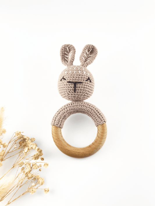 Brown Bunny Baby Gift Set: Crochet Rattle, Dummy Clip, and Teether