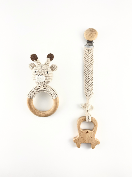 Cream Deer Baby Gift Set: Crochet Rattle, Dummy Clip and Teether